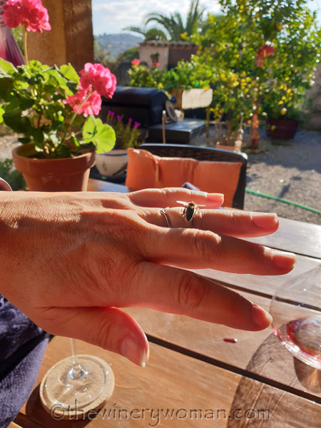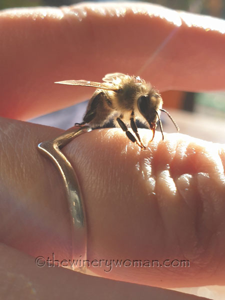 The day before I had had a bee land on my hand briefly and thought I would see if she would do the same. I put my hand down on the table and she immediately crawled up on my hand. She was attempting to clean the wine drops off herself. She just wandered around for almost 15 minutes.